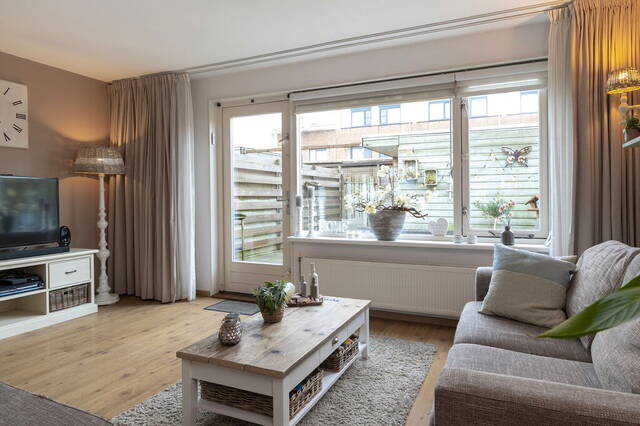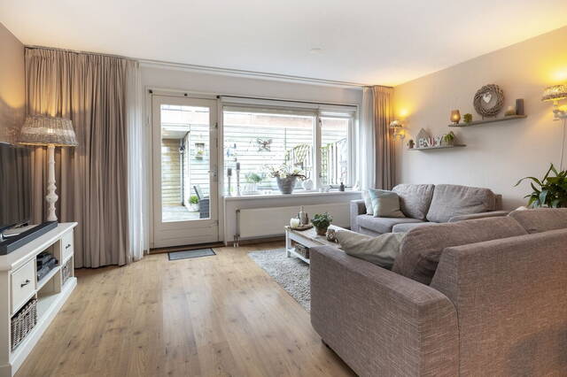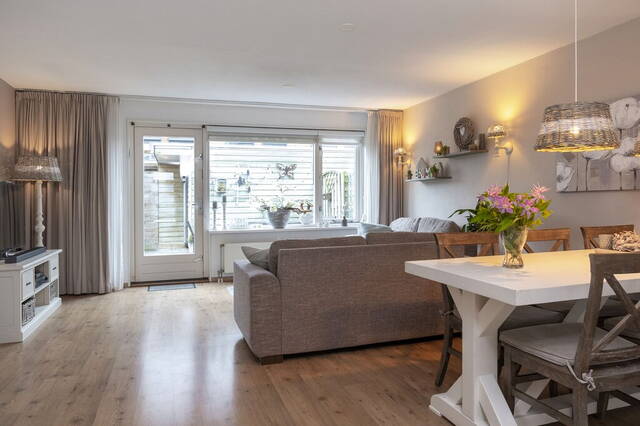 De woonkamer is aan de achterzijde uitgebouwd waardoor er ruimte is voor een grote zithoek, enkele kasten en een zespersoons eettafel. Door de grote ramen aan de zuidoostkant schijnt het zonnetje naar binnen; dit maakt de woonkamer lekker licht. Onder de trap is een diepe kast, een super handige bergruimte waar je veel spullen kwijt kunt.