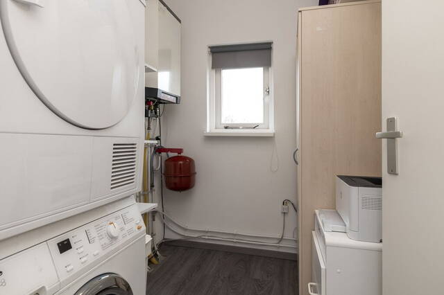 De wasruimte is groot genoeg voor de cv-ketel, wasmachine en droger en dan blijft er nog genoeg ruimte over om spullen op te bergen. Bij de huidige bewoners is de slaapkamer op deze verdieping de ouderslaapkamer, voorzien van airconditioning, rolluiken en een thuiswerkplek.