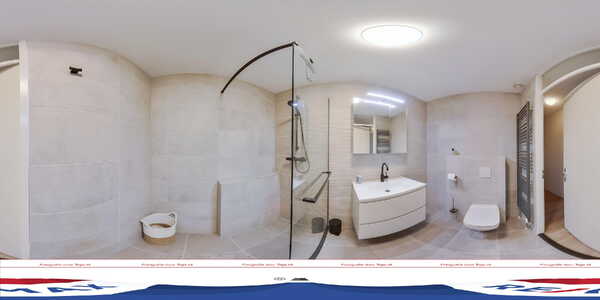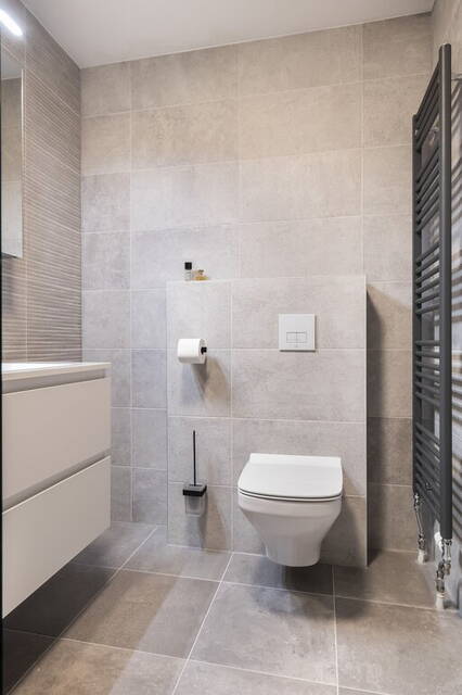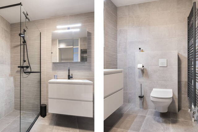 De moderne, luxe badkamer is in 2020 vernieuwd. De ruimte is ingedeeld met een grote inloopdouche, tweede toilet, hoge wandradiator en een wastafelmeubel met spiegelkast. De matzwarte douchewand en kranen vormen een smaakvol geheel met de mooie wand- en vloertegels.