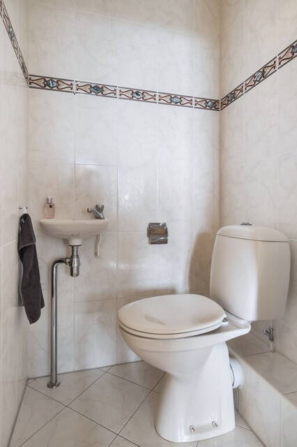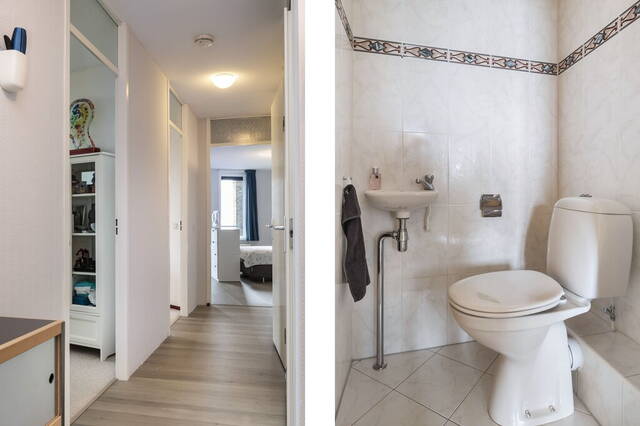 Vanuit de hal is een aparte toiletruimte met fonteintje te bereiken. Tenslotte de inpandige bergruimte links van de meterkast. Dit is de plek niet alleen de plek waar de wasmachine en droger staan, hier is ook ruimte om spullen op te bergen.