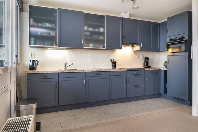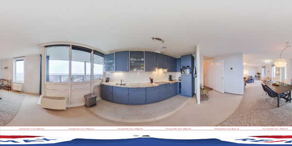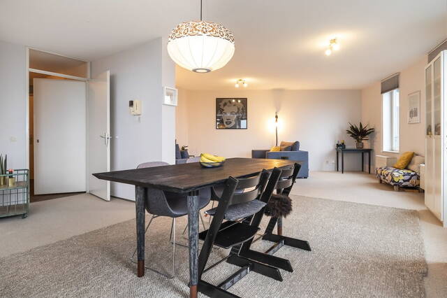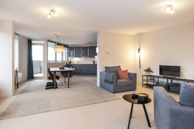 We gaan rechtdoor naar de ruime woonkamer met keuken; een prachtige leefruimte aan de zuid/zuidwestkant van het gebouw. Door de grote ramen valt de middag- en avondzon naar binnen waardoor het heerlijk licht is in de woonkamer en keuken. In de keuken is ruimte voor een grote eettafel en de woonkamer is groot genoeg voor een mooie zithoek met tv-meubel. De keuken heeft een lange wandopstelling met een kleine hoek, voorzien van een marmeren werkblad. Alle benodigde apparatuur is ingebouwd: een inductiekookplaat, vaatwasser en de koelkast allen vernieuwd in 2019, een afzuigkap en een combi-oven.