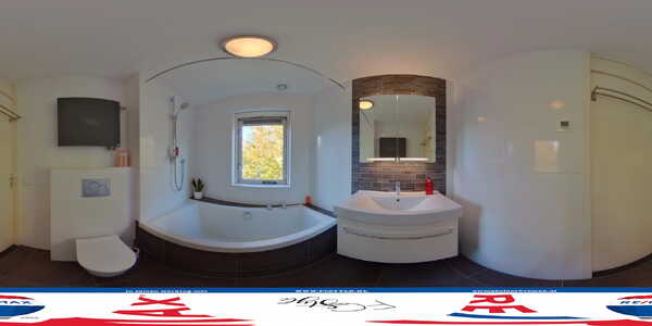De moderne badkamer is vernieuwd in 2014 en is, dankzij het raam, een hele lichte ruimte. Zowel de wanden als de vloer zijn geheel betegeld en blikvanger is het grote bad onder het raam. Verder heeft deze badkamer een tweede toilet, elektrische vloerverwarming, zwarte radiator en een wastafelmeubel met spiegelkast.