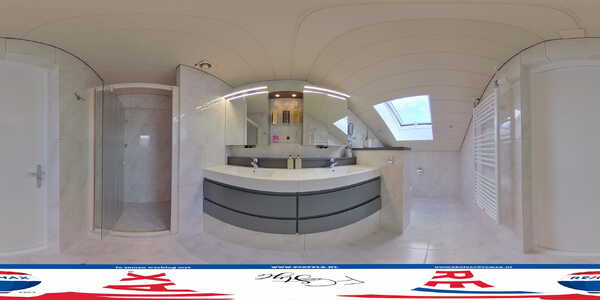 De badkamer met dakraam is betegeld in lichte kleuren en de ruimte is optimaal ingedeeld. U heeft de beschikking over een inloopdouche, een dubbele wastafel met meubel (2019), spiegelkast (2019) en een wandcloset (2014).