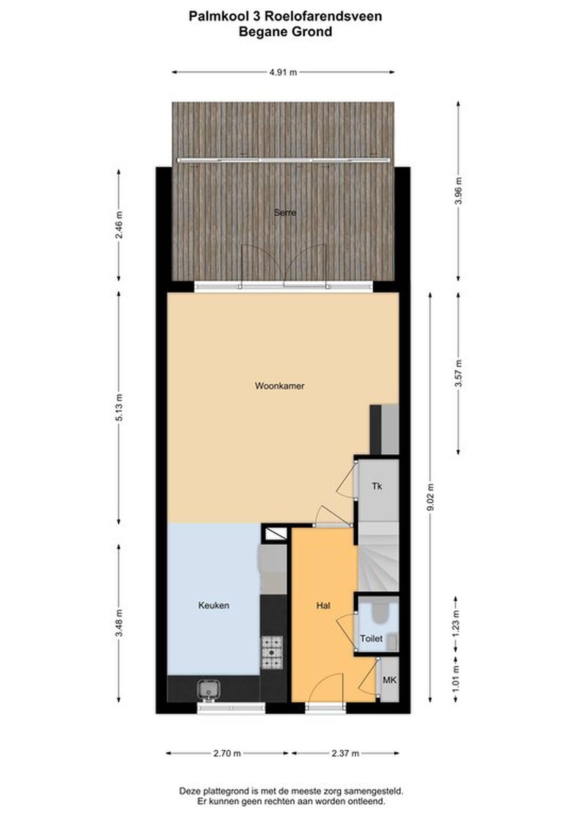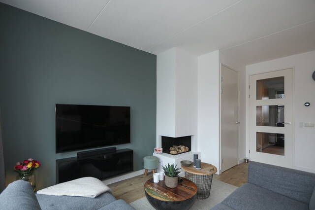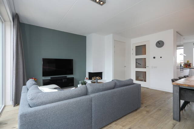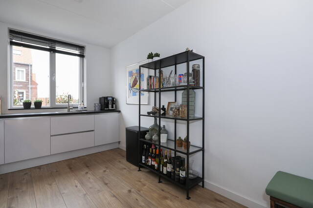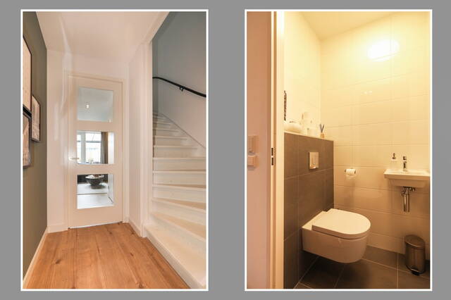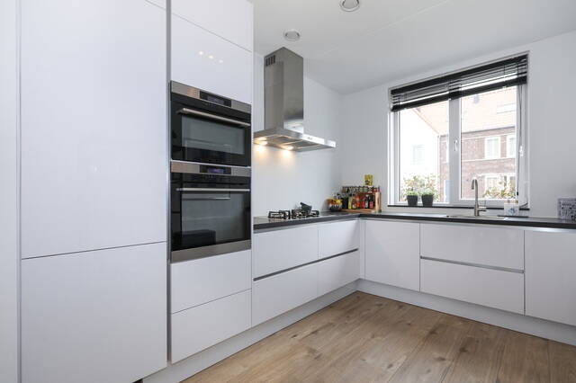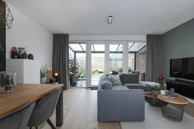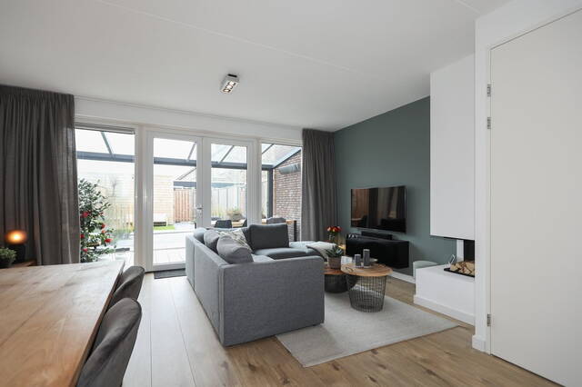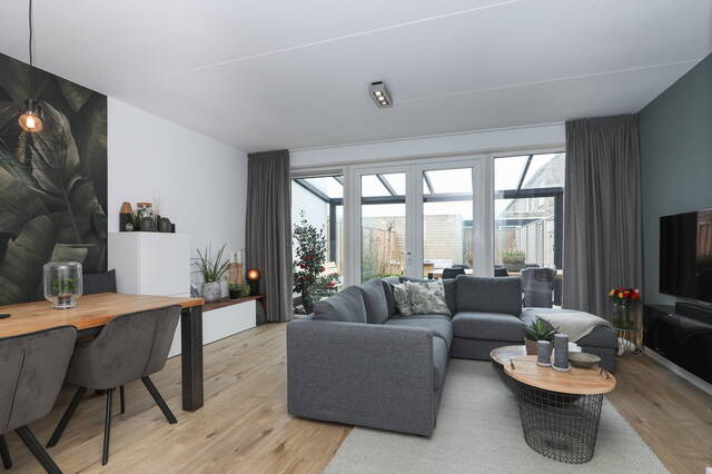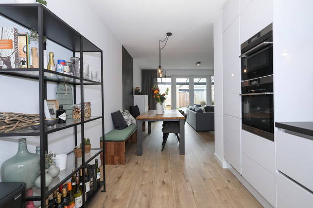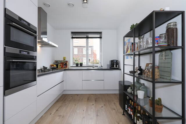 Entree, ruime hal met meterkast, modern zwevend toilet met fontein en de trapopgang naar de 1e verdieping. Vanuit de hal toegang tot de lichte woonkamer met open haard (Bio-ethanol). De woning heeft openslaande deuren naar de zonnige diepe tuin met serre waar je prinsheerlijk met je gasten kunt zitten en je de gehele dag kan genieten van de zon. De woonkamer is voorzien van een (brede) laminaatvloer, lichte wanden en trapkast. De moderne keuken in lichte kleurstelling is voorzien van diverse inbouwapparatuur met o.a.: 5-pits gaskookplaat, afzuigkap, vaatwasser, grote koelkast metvriesvak, oven en combi-oven/magnetron. Tevens voorzien van een extra loze leiding voor de aanleg van een elektrische kookplaat zodat ook deze keuken helemaal toekomstbestendig is.