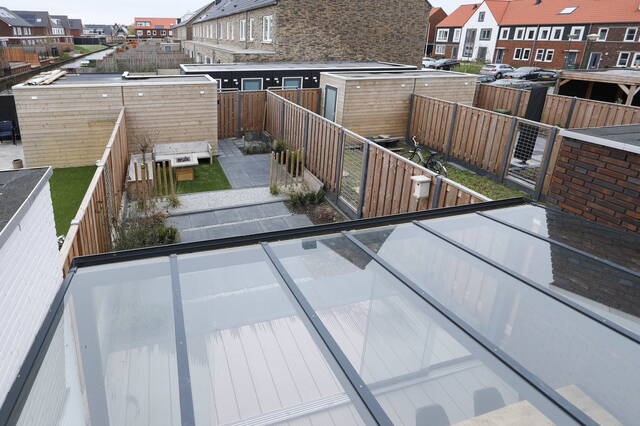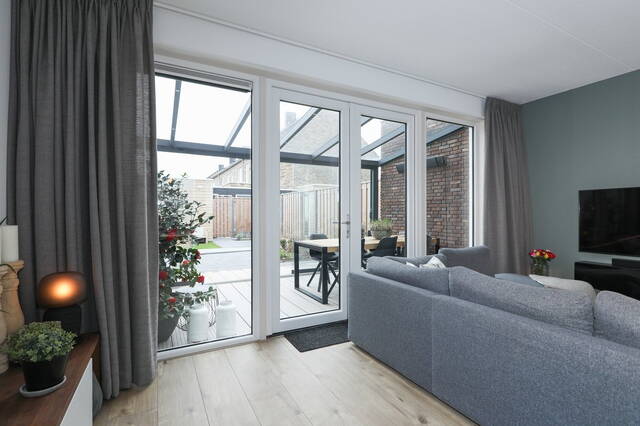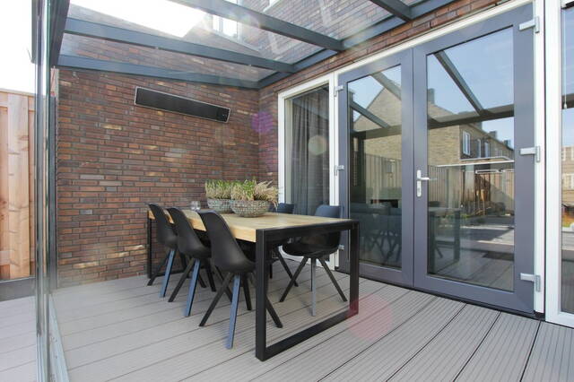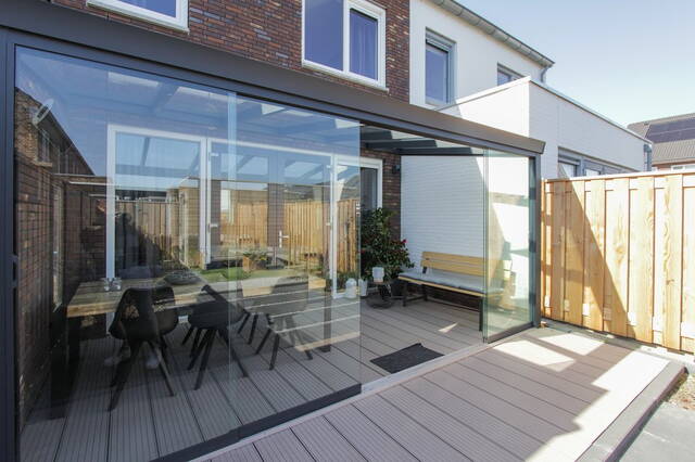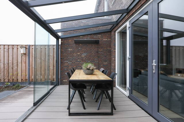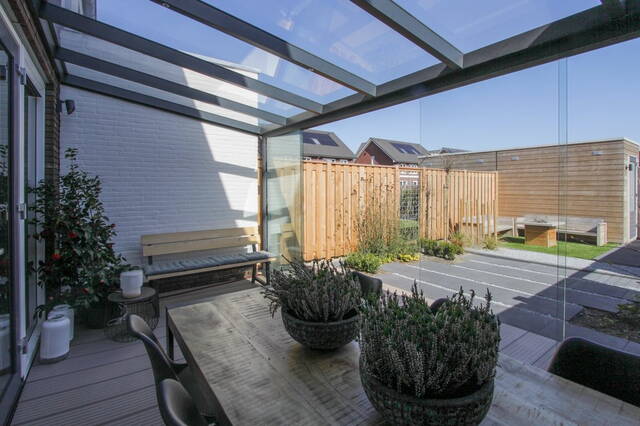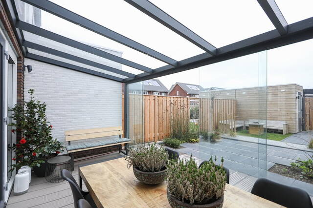 Door de openslaande deuren kom je eerst in de eigentijdse serre terecht waar je prinsheerlijk met je gasten kunt zitten en welke je volledig kunt afsluiten zodat het lekker warm blijft. De diepe en goed verzorgde tuin is op het noordoosten gesitueerd. Achterin de tuin is vanuit de bouw een vrijstaande houten berging gerealiseerd voorzien van elektra.