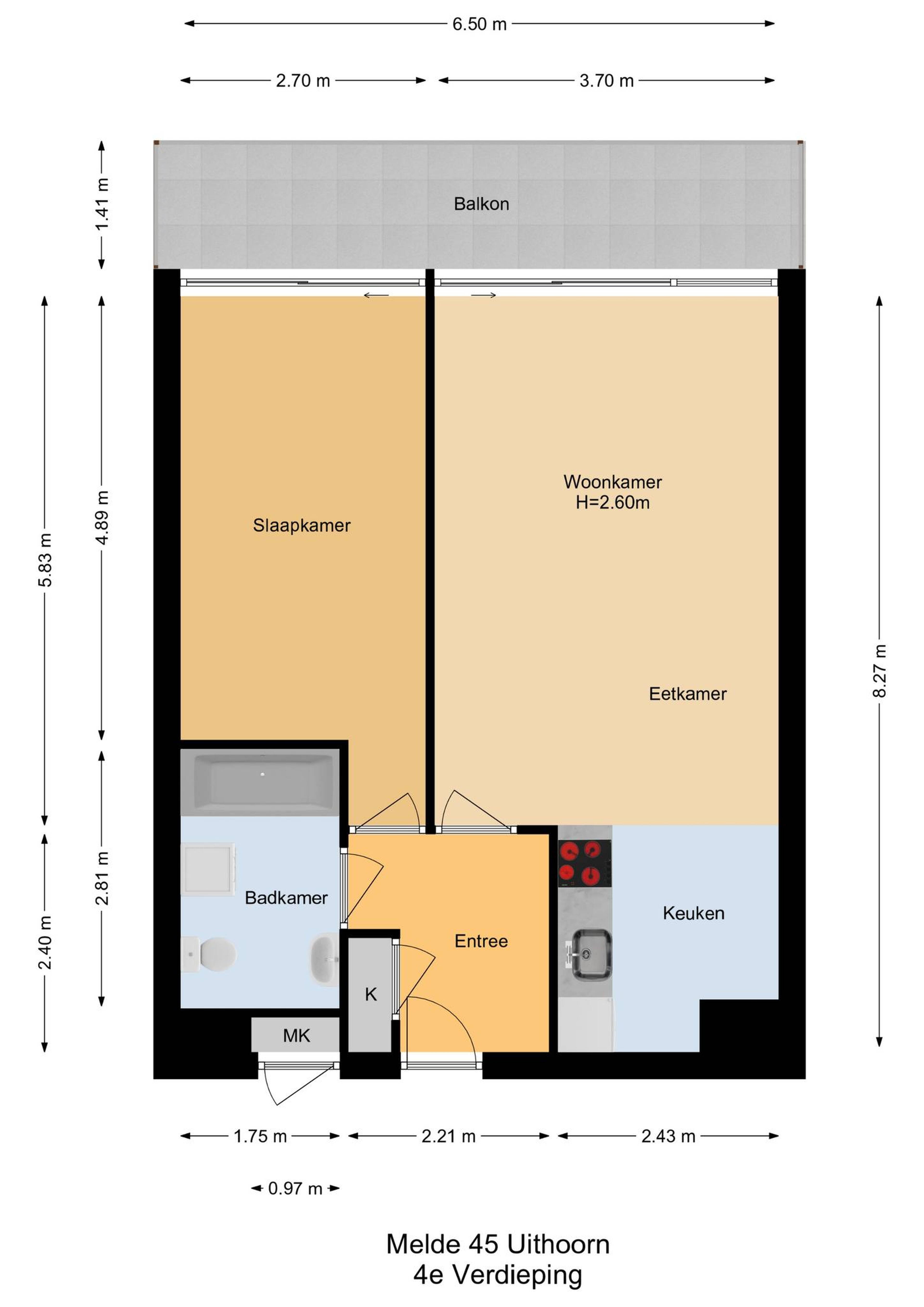 Naast de slaapkamer is de badkamer gesitueerd. Hier kunt genieten van een bad en een fijne douche. Verder ziet u in de badkamer een toilet, wastafelmeubel en een plek voor een badkamerkast. Zowel de wanden als de vloer zijn geheel betegeld.