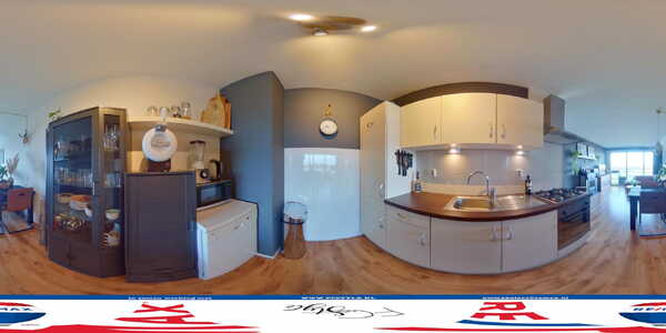 Via het eetgedeelte is de open keuken te bereiken. De nette wandopstelling heeft een gaskookplaat, afzuigkap, oven en een koelkast met vriesvak. Tegen de andere muur kunnen een vaatwasser en een grote servieskast staan.
