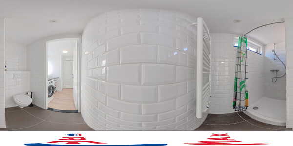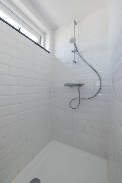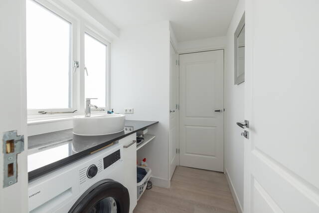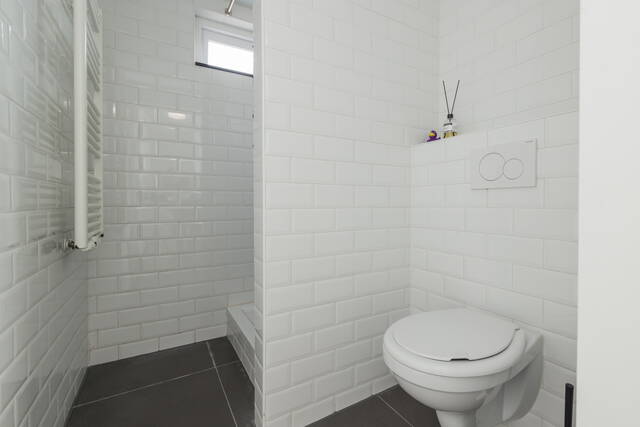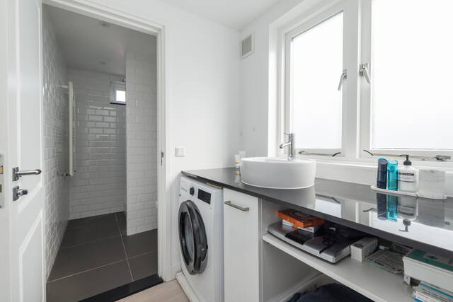 De badkamer is verzorgd en modern afgewerkt, met een inloopdouche, aparte wastafel en strak tegelwerk. De wasmachine kan netjes onder het luxe werkblad worden weggewerkt. Alles is functioneel en netjes onderhouden, waardoor u hier direct gebruik van kunt maken