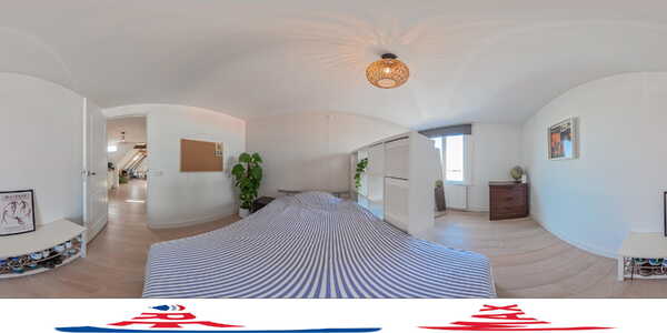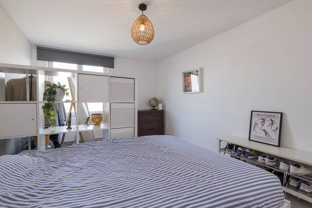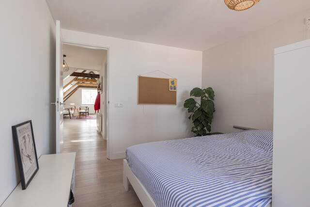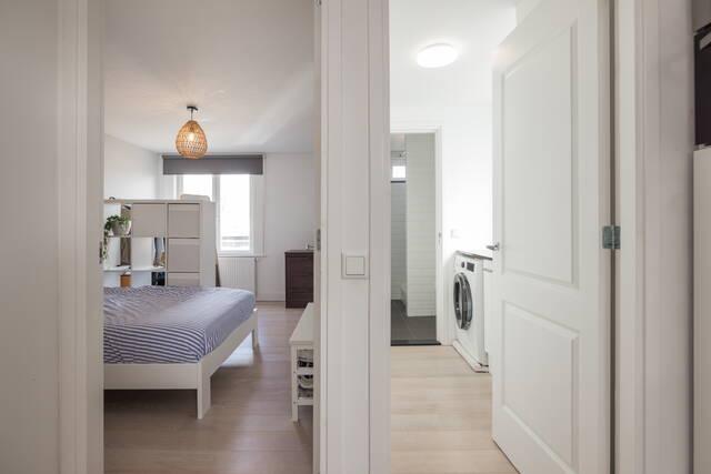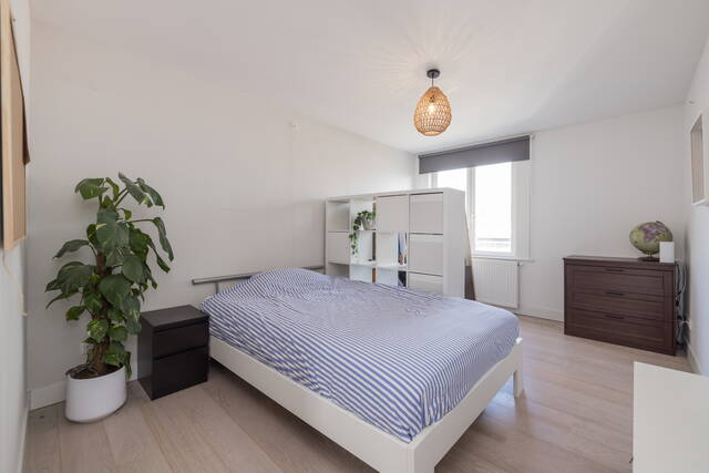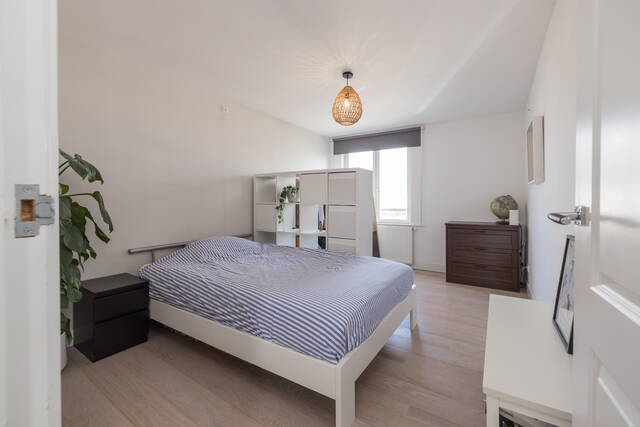 De ruime slaapkamer biedt voldoende plaats voor een tweepersoonsbed en extra kastruimte. Grote ramen zorgen ook hier voor aangenaam daglicht.
