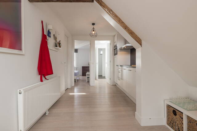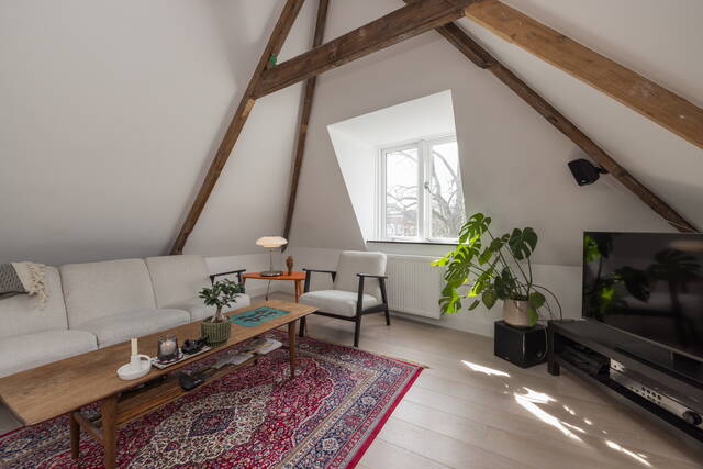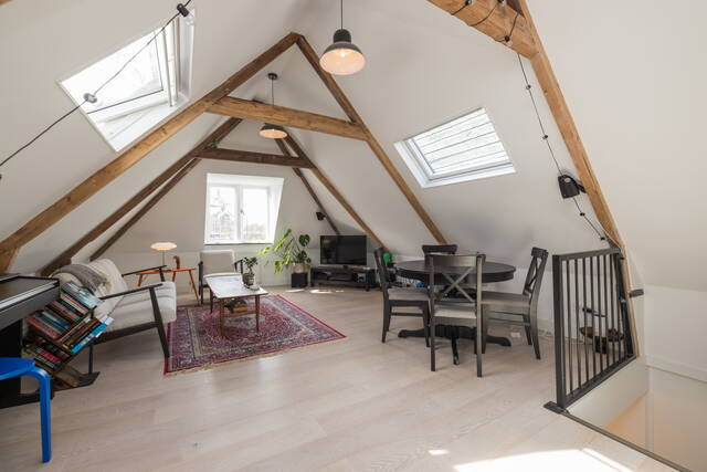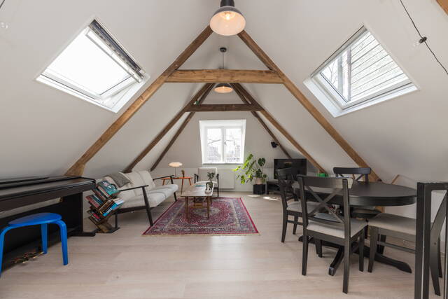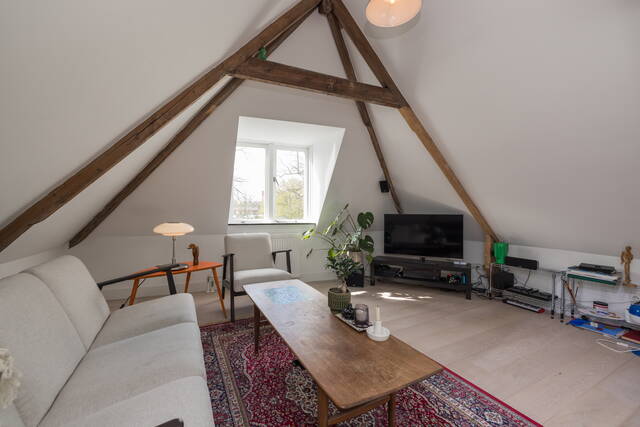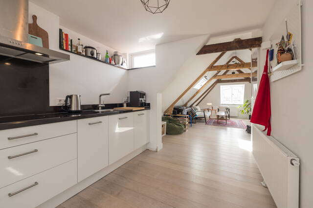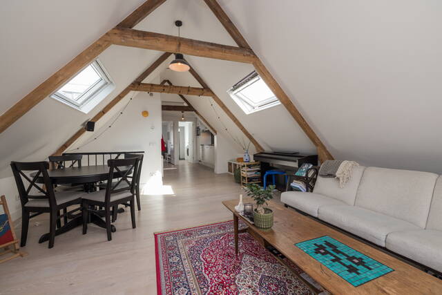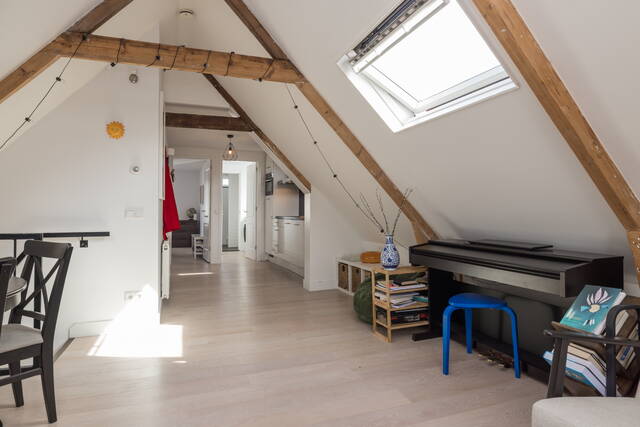 De woonkamer vormt het hart van de woning en kenmerkt zich door de prachtige, zichtbare houten balken die zorgen voor een warme en karaktervolle uitstraling. Dankzij de twee grote dakramen valt er volop natuurlijk licht naar binnen, wat de ruimte extra ruimtelijk maakt. Tevens heeft u een vrij uitzicht over “de Burcht”. Er is voldoende plek voor een gezellige zithoek en een eethoek. De open indeling, mooie laminaatvloer en de hoge nok geven het geheel een loft-achtig gevoel.