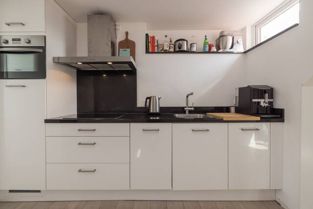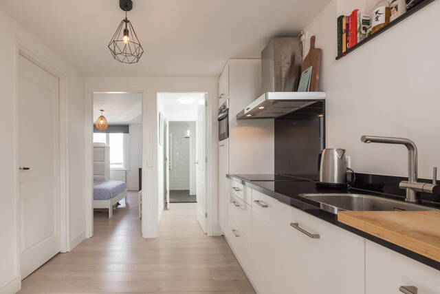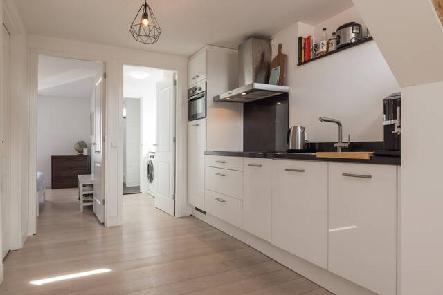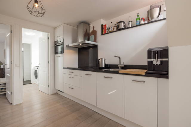 De moderne, strak vormgegeven keuken is praktisch ingericht en voorzien van diverse inbouwapparatuur. Het werkblad biedt voldoende ruimte om te koken (inductie), terwijl de lichte kleurstelling zorgt voor een frisse uitstraling. De keuken staat in open verbinding met de rest van het appartement.